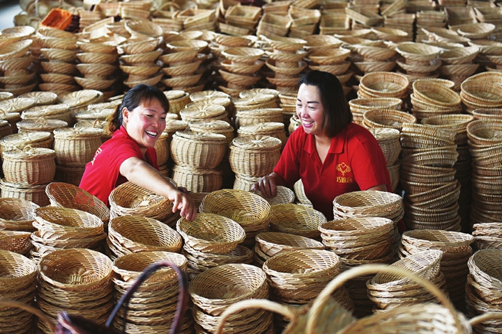 广灵县巧娘宫手工编织专业合作社的社员通过培训有了一技之长,实现就业增收。图为社员们在车间交流柳编技术。