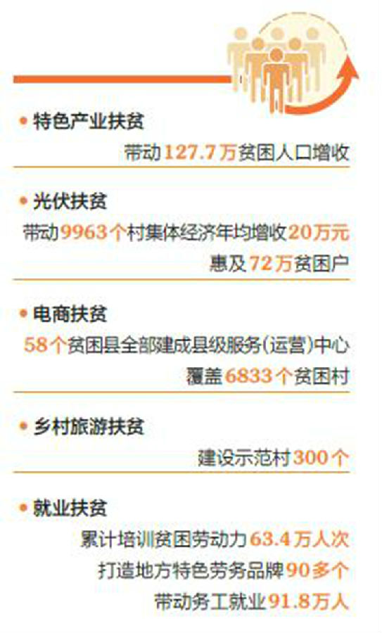 脱贫攻坚战以来,我省立足实际,按照“五个一批”精准扶贫路径,因地制宜组织实施特色产业扶贫、培训就业扶贫等八大工程二十项行动,有力促进和带动了贫困人口增收脱贫。