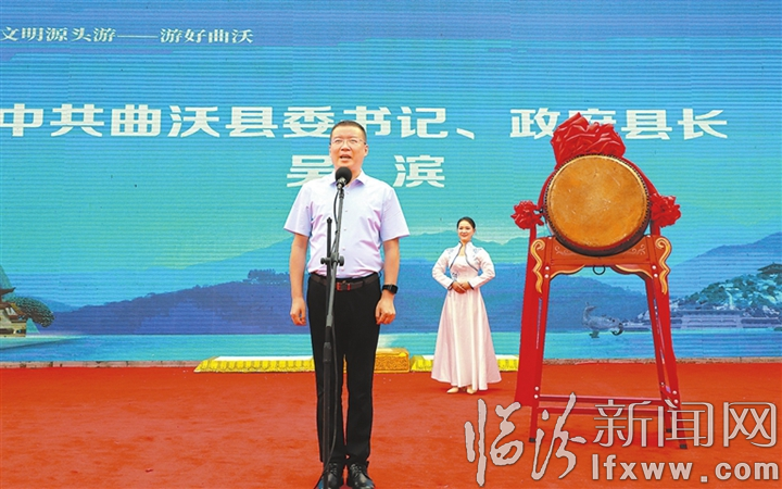 县委书记、县长吴滨宣布曲沃县第五届全域旅游晋都行文化旅游活动月开幕并敲击竖鼓。