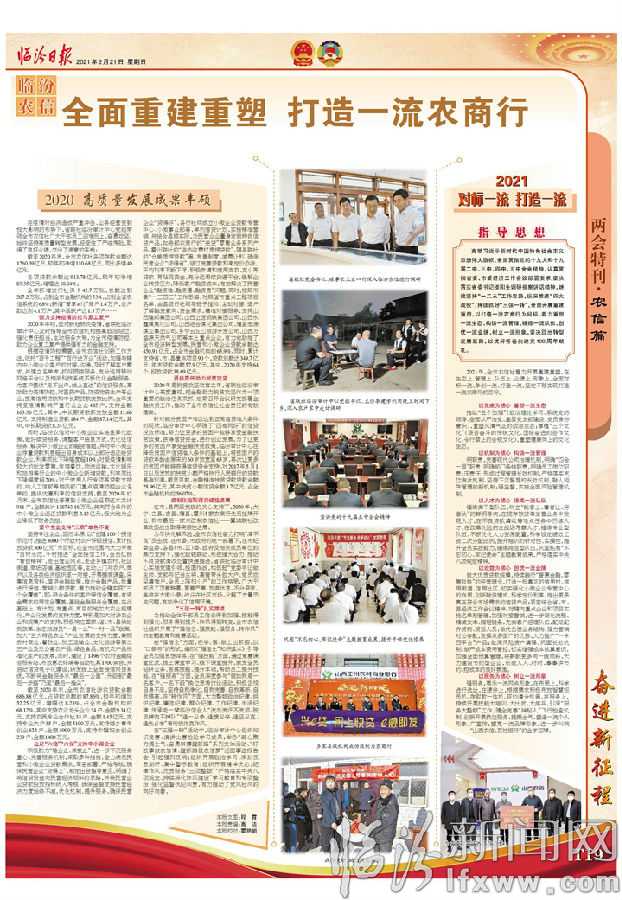 2021年,全市农信社着力开展重建重塑,在生态上、管理上、队伍上、业绩上、形象上,全面对标一流、争创一流、打造一流,坚定不移实现打造一流农商行的目标。
