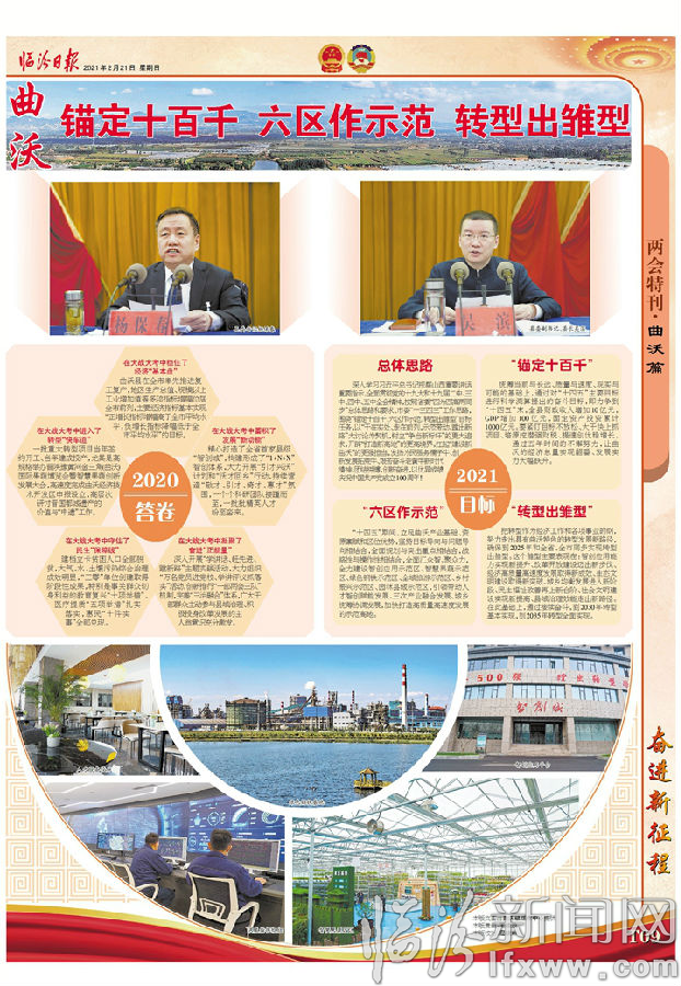 “十四五”期间,立足曲沃产业基础、资源禀赋和区位优势,坚持目标导向与问题导向相结合,全面规划与突出重点相结合,战略性与操作性相结合,全面汇众智、聚众力,全力建设智创应用示范区、智慧果蔬示范区、绿色钢铁示范区、全域旅游示范区、乡村振兴示范区、园林县城示范区,引领带动人才智创赋能发展、三次产业融合发展、城乡统筹协调发展,加快打造高质量高速度发展的示范高地。