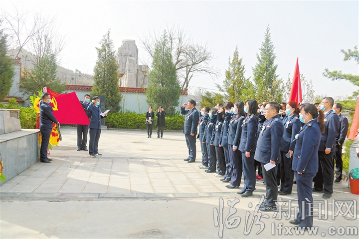 临汾新闻网讯 三月三十日,国家税务总局翼城县税务局组织党员干部前往翼城牛家坡烈士陵园,开展“学党史 守初心 忆先烈 葆本色”主题党日活动。图为党员干部在烈士纪念碑前重温入党誓词。