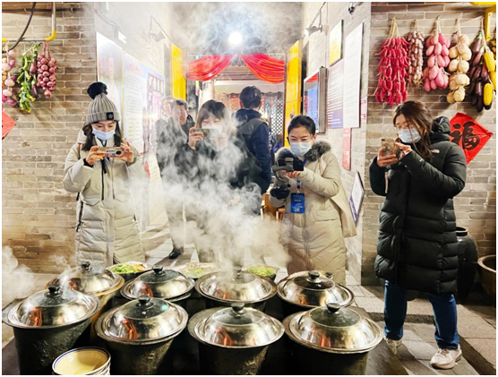 原平锅盔、驴蹄子、胡麻油月饼……泰山庙巷一串串色彩斑斓的霓虹灯中,氤氲着人间烟火气,“俘获”了一桌桌天南海北的“吃货”。