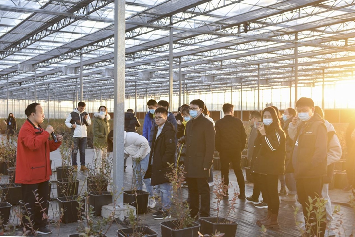 随着杨宇豪的脚步走进园区,山西农谷科芯农业科技有限公司生产经理王飞便接过话筒,向记者们介绍起了一种在山西很少种植的水果。“我们这个温室里,种植的都是一年生的蓝莓,一共有三个品种。”王飞看到有细心的记者正在观察蓝莓树的落叶,笑着解释道,“目前蓝莓树处于休眠期,所以落叶情况很正常,这也是为了保存养分。等到明年春天蓝莓结果前,我们会把温室内的温度慢慢提高,蓝莓树也会重新长叶开花。”