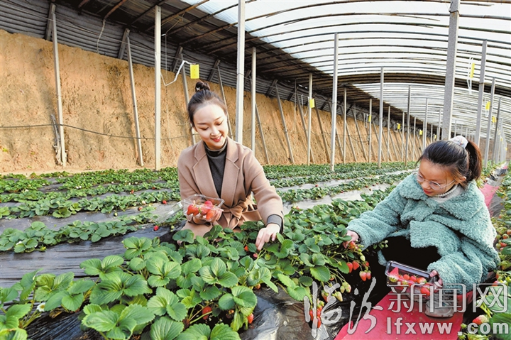 临汾新闻网讯 春节期间,浮山县印象田园里的草莓陆续成熟,市民结伴前来采摘。图为市民在草莓园采摘。