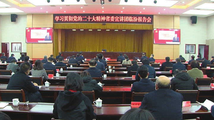 按照中央及省委的统一部署和要求,12月9日,学习贯彻党的二十大精神省委宣讲报告会在临汾举行。省委宣讲团成员,省教育厅党组书记、厅长马骏以录制视频的方式进行线上宣讲。临汾市四套班子领导,市委各部门、市直及驻市各单位负责人等百余人聆听了报告。