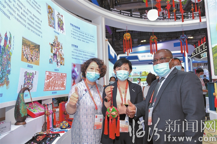 自“投洽会”开幕以来,投资热点城市·临汾展区,无处不在的“临汾元素”吸引了众多海内外嘉宾、客商前来参观、交流和洽谈。图为贝宁驻华大使馆的Luc Comlan EBAH来到展区,为临汾非遗作品“太平绣球”点赞。 记者 闫锐鹏 摄