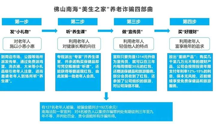 法院审理查明:2020年7月,甘某等4人在南海区大沥镇设立“美生之家”公司,并通过制定“顾客邀约话术”、精心设计布置办公室和讲课场所包装成一家 “养生公司”。公司成立后,在周边市场、公园等场所派发宣传单,以免费派小礼品等方式吸引老年人注意,以“养生保健”“慈善关爱”的旗号打消老年人顾虑,让老年人到公司听“养生课”。课中,又以送保健品、赠旅游、充值返利、拉客有奖等为诱惑,发展了一批老年人成为会员。其后,利用有些老年人不熟悉上网,该公司开发了所谓的在线理财平台,以“高回报”“无风险”对外兜售理财产品,承诺老年人在购买理财产品后,可随时在线查询理财情况。为骗取老年人信任,公司还经常开展发放理财现金分红、免费赠送保健品和组织免费旅游等活动。先后有127名老年人被骗192万余元。