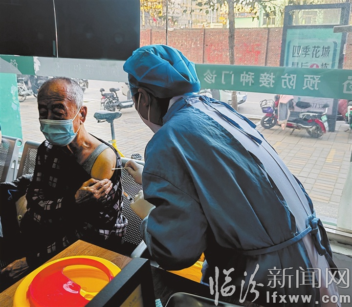 临汾新闻网讯 连日来,尧都区医疗集团乡贤街卫生服务中心医护人员进入辖区开展疫苗接种宣传工作,对于60岁以上行动不便或子女不在身边的老人,上门为其进行健康评估及疫苗接种,筑牢全民健康防线。图为医护人员正在为老人接种疫苗。