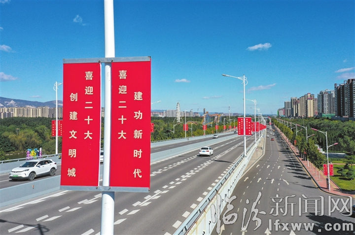 临汾新闻网讯 连日来,全市各主干街道都精心布置了“喜迎二十大,建功新时代”的主题宣传灯杆公益广告,营造出浓浓的喜庆氛围,迎接党的二十大胜利召开。图为市区滨河东路主题宣传灯杆公益广告。