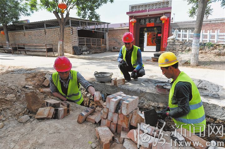 在段村党群服务中心右侧,10余名工人分工明确,正在修缮门楼、安装线路、粉刷墙壁、修建公共卫生间,一旁的施工负责人郭斌拿着施工图纸,检查工程建设情况。