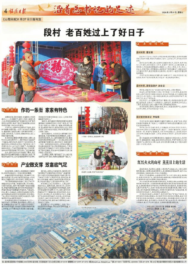 段村是黄土高坡上的一个小山村,曾属吕梁山集中连片特困地区,有635户1700多口人,2019年12月整村脱贫。2022年1月26日,习近平总书记来到山西看望慰问基层干部群众,在段村勉励当地干部群众继续巩固脱贫攻坚成果,扎实推进乡村振兴,让群众生活更上一层楼,在推进农业农村现代化中越走越有奔头。段村干部群众牢记嘱托,铆足干劲抓落实,发展壮大村集体经济,勇蹚强村富民新路,成为全省乡村振兴示范村和全国乡村治理示范村。