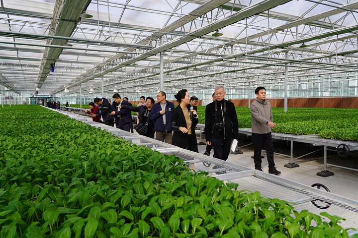 之后,记者一行来到曲沃智慧果蔬产业示范区,曲沃县农业农村局局长谢新民向大家介绍了当地特色农业产业的发展规模、优势,以及粮果菜畜齐头并进的高质量发展新格局。期间,记者们参观了示范区的无土栽培蔬菜基地。望着玻璃温室内高架上一排排鲜嫩翠绿的蔬菜,有记者感叹:“这里的农业太发达了,难怪曲沃县是全国580个蔬菜重点县之一。”