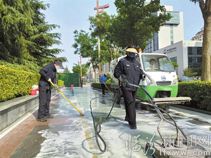 为减少道路扬尘污染,市城市管理局环卫工人正在清洗市区向阳西路人行道 记者 刘 超 摄