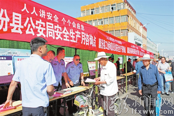 临汾新闻网讯 近日,襄汾县在城区中心广场开展“安全生产月”宣传咨询活动。图为该县公安民警在向群众发放宣传手册。