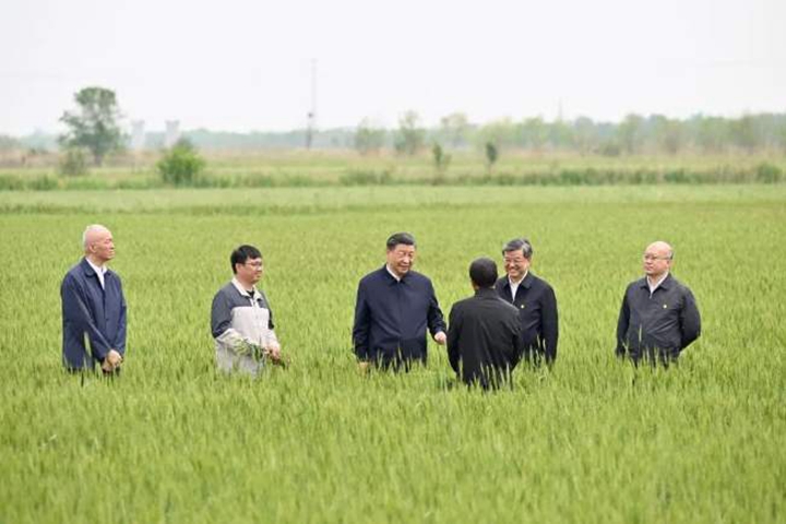 2023年5月11日上午,习近平在河北省沧州市黄骅市旧城镇仙庄片区旱碱地麦田考察时,同种植户、农技专家亲切交流。新华社记者 殷博古 摄