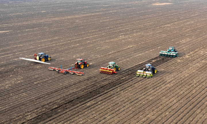 △2023年春,黑龙江双鸭山,北大荒农业股份友谊分公司第五管理区玉米智能机械化作业播种现场。