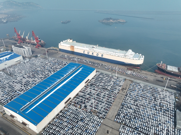 △在江苏连云港港东方港务分公司码头,货轮靠泊准备装载汽车出口海外。