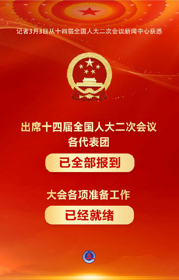 记者3日从十四届全国人大二次会议新闻中心获悉,出席此次会议的各代表团已全部报到,大会各项准备工作已经就绪。