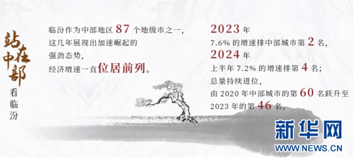 新华网太原11月13日电(王亮)这是来自山西省临汾市的一组亮眼数据:2023年GDP增长7.6%,在中部87个地级市中位居第2,2024年前三季度GDP增长6.6%,位居第7;GDP总量过去三年增加了810亿元,在中部城市排名跃升了14位。