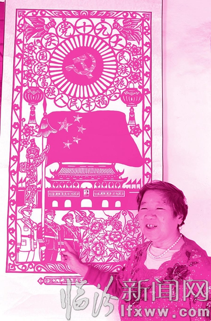 临汾新闻网讯 日前,剪纸艺人解白莲创作了《喜迎十九大》剪纸作品,迎接党的十九大胜利召开。