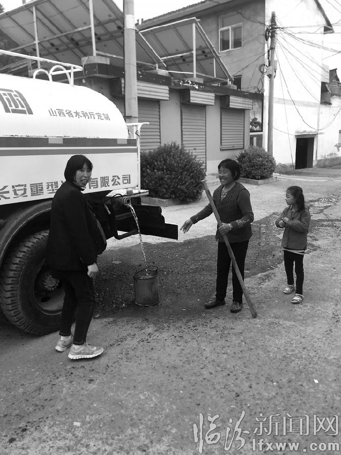 临汾新闻网讯 近日,安泽县府城镇神南村因水泵故障导致停水,该村村委会及时与自来水公司沟通联系,将供水车开到老百姓家门口送水,保证了村民正常用水。图为神南村村民在供水车旁有序接水。