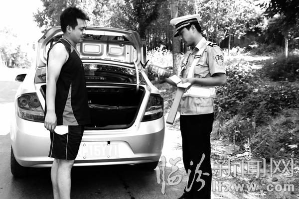 临汾新闻网讯 为确保道路交通安全,安泽县交警大队民警克服天气炎热,认真检查过往车辆。图为民警在检查一辆轿车灭火器是否能正常使用。 邓淑红摄