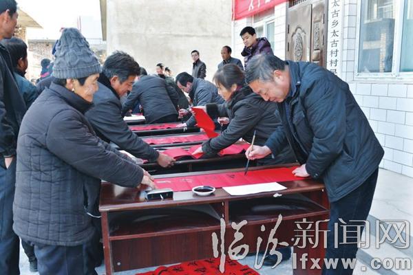 临汾新闻网讯 近日,大宁县县委宣传部、县文联和书画家协会深入该县太古乡开展“我们的中国梦,送春联进万家”活动。20位书法家现场挥毫泼墨,为群众书写春联3000余幅,受到老百姓的好评。(侯耀强 冯杰伟 )