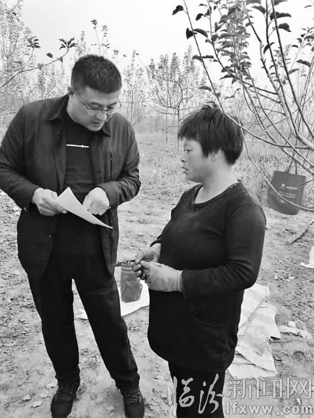 驻村工作队队长马建会在扶贫户付锁龙的苹果地里了解苹果丰收及销售情况。