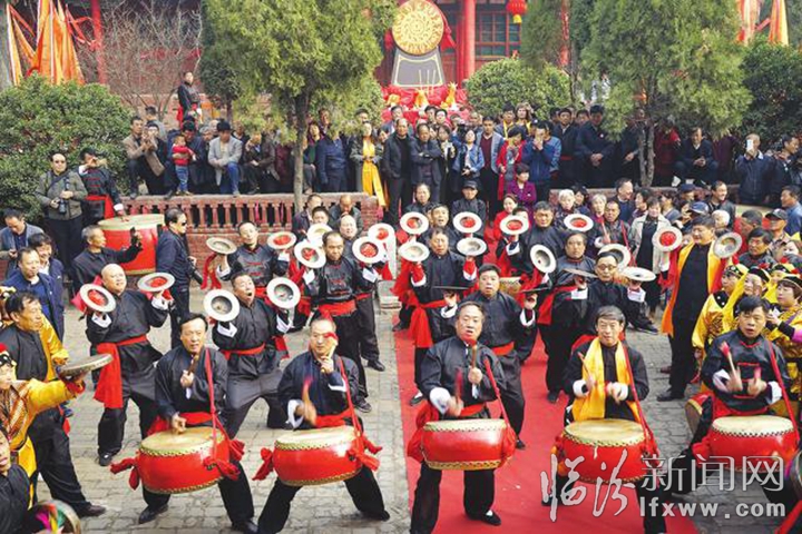 “擂鼓鸣炮……”9时,随着祭鼓主持人一声吆喝,在震天的锣鼓声中,祭鼓仪式开始。恭行奠酒、恭读祭文、行施拜礼等仪式有条不紊地进行。