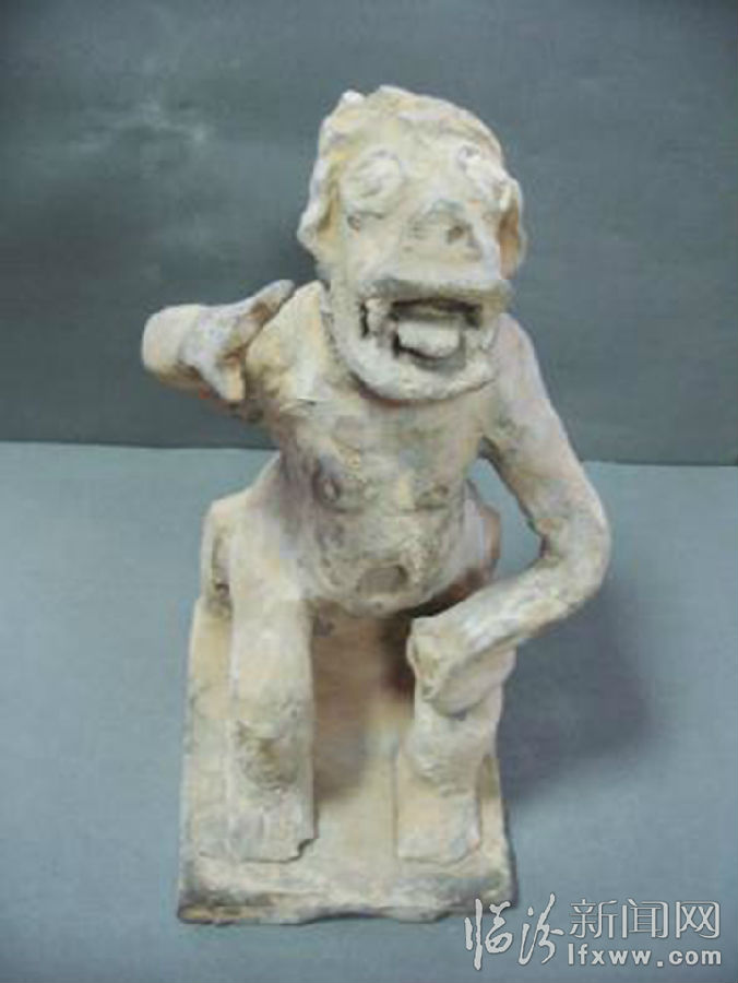 这件陶器为青褐色,上面粘有黄土,器形略有残缺,但整体保存较好。人物面貌丑陋,蹲坐在一支撑物上,左手执一陶罐,陶罐口小肚大,放置于左腿上,残缺的右手放于右肩靠上部位。
