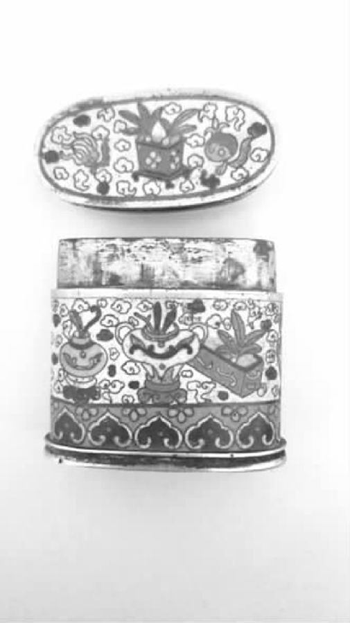 段延峰收藏的烟膏盒大有来头,制作于清代晚期,采用铜胎掐丝珐琅工艺,俗称景泰蓝。烟膏盒用红铜制胎,以铜丝掐好图案于胎上,用深蓝、天蓝、红、黄、白等珐琅彩填色,露胎处再做鎏金处理,工艺复杂,在当时价格不菲。这个烟膏盒呈扁圆型,通体博古文饰,盖子上方有石榴和佛手图案,代表多子多福、吉祥寓意。底部为暗八仙图案,以铁拐李所用的法器“宝葫芦和拐”以及太极图案为主图,有医治百病的含义。