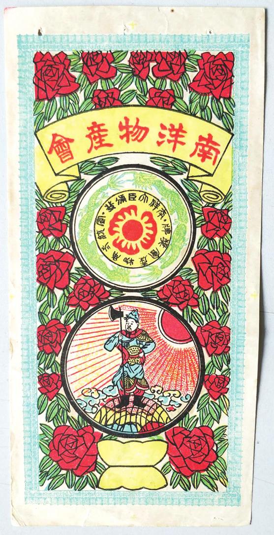 这张老商标以红花绿叶作底,上边书卷形式的黄色空白处写着“南洋物产会”,下边有两个圆形图案,上边圆形内还套着一个圆形,里边的圆形中心是红色火球及火焰,周围写着“南洋大臣颁发宣统贰年物产会奖牌”,内圆与外圆中间是首尾相连的两条苍龙。下边圆形内的图案也非常有内涵,红色的太阳普照大地,圆形的地球周围祥云朵朵,太阳与地球中间是身穿盔甲的将军,将军气宇轩昂,右手持斧钺,左手叉腰,侧面注视远方,像要开疆扩土征战四方。“南洋物产会”用此图也有开拓市场的美好寓意。
