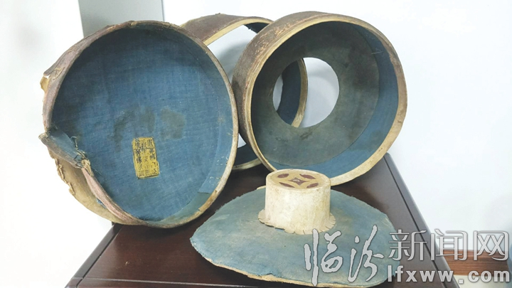 那是一个清代的官帽匣子。在当时,官帽匣子不是一件普通人能买、能用的物品。这个官帽匣子是专为官员存放官帽所用的物品,高3厘米,直径37厘米,为牛皮朱漆制作,分为上下两层,全部拆开可分成四部分。一打开官帽匣子,就能看到金钱图案的凸柱,作用是固定官帽,并有“钱在眼前”的寓意。官帽匣子的盖子多处掉漆且有四处缝合,通过缝合接口可知,帽匣以硬纸板为骨架,外包牛皮,牛皮上刷朱红漆;帽匣内以蓝布衬底,手工针脚密密缝合,整体制作十分精美。