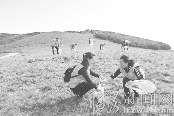 临汾新闻网讯 5月24日,在历山风景区,我市的旅游志愿者正在高山草甸上捡拾垃圾。
