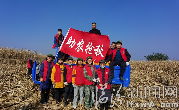 当日,在窑铺村李耀庆的玉米地里,40多名志愿者身穿红色马甲,手戴白色手套,竭尽全力抢收玉米。他们热情洋溢,干劲十足,有的掰玉米、有的割秸秆、有的装车、有的运输,各个环节衔接有序,配合默契,整个现场一片热火朝天的繁忙景象。