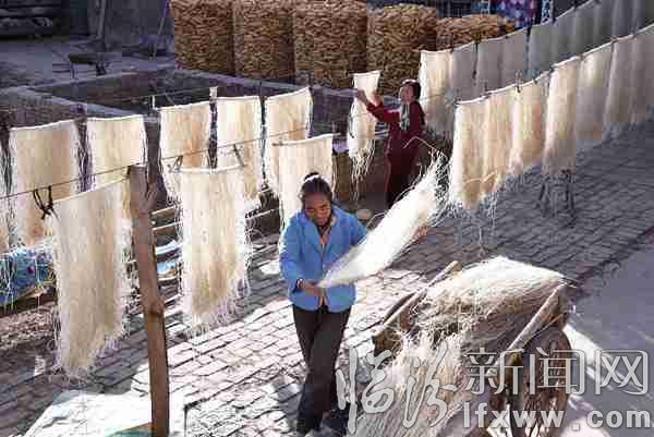 临汾新闻网讯 浮山县响水河镇西沟村是当地远近闻名的“粉条村”,生产的粉条远销省内外,每年一到这个季节,村里到处是加工粉条的热闹场景,村民们也凭借做粉条鼓起了自己的腰包。图为村民在院中晾晒粉条。 张旦 摄