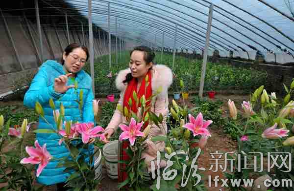 临汾新闻网讯 1月20日,浮山县张庄乡徐村村民丰海丽(左)正在自家的百合花大棚内与前来选购百合花的顾客交流种植心得。之前,丰海丽一直以种植大棚蔬菜为主,每个大棚平均每年可以收入两万元左右。今年以来,在当地农业部门的引导与技术指导下,她率先种植了8000株观赏百合花,目前,百合花正值花期,在满足当地节日市场的同时,远销临汾、长治等地,预计收入可达6万余元。 闫锐鹏 程俊刚 摄