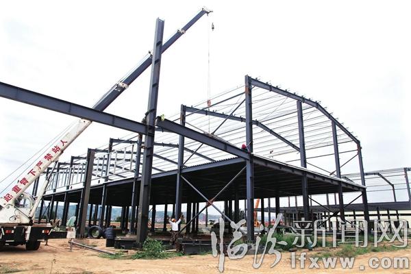 临汾新闻网讯 浮山县坚持把推进重点项目建设作为加快经济发展的重要措施,不断推进产业转型升级,努力提升经济发展的质量和效益。该县威盛达防火建材公司是利用当地尾矿资源进行深加工的企业,共投资2亿元,建筑总面积9万余平方米,预计2017年6月份投产,正式运营后可实现年产值1亿元、新增就业岗位1000余人。图为工人师傅正在进行厂房钢结构吊装作业。 卫琦 摄