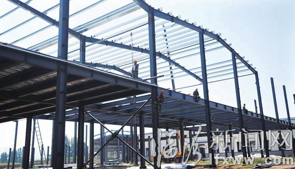 临汾新闻网讯 浮山县威盛达防火建材公司是一家以生产防火门为主体的生产企业。该企业总投资2亿元,预计2017年6月份投产,正式运营后可实现年产值1亿元左右,利税2000余万元,新增就业岗位1000余人,带动了相关企业的发展。图为工人们正在安装钢结构厂房。记者 魏华 摄