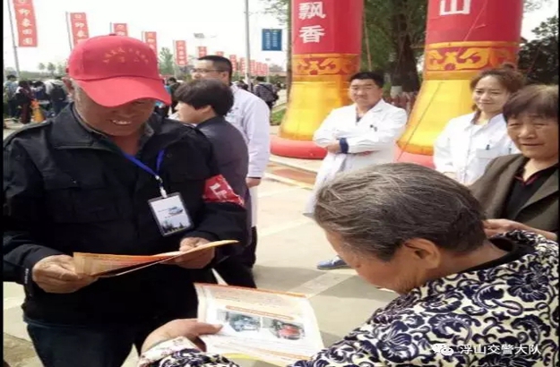 景区负责维持秩序人员主动要求兼任交通安全宣传员,向群众发放宣传资料