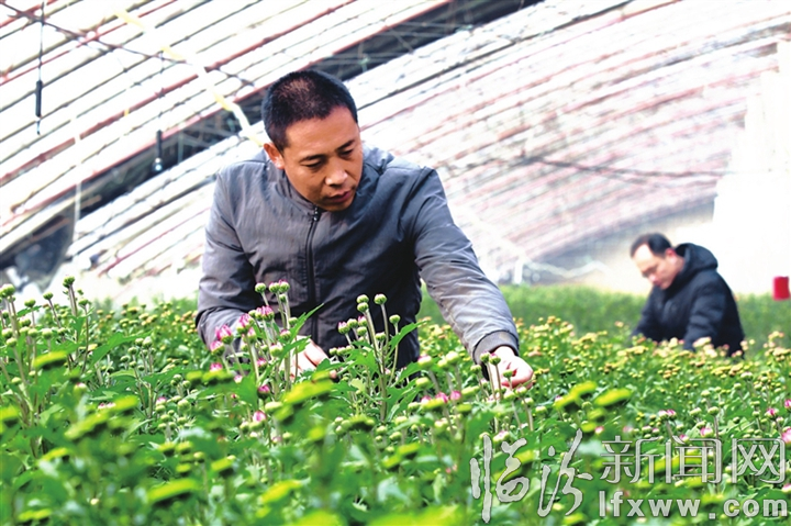 临汾新闻网讯 近日,浮山县印象田园农业生态园一派繁忙景象。种植户盖登峰家种植的大棚菊花,品种多、质量好,目前种植的五十多个颜色菊色,主要销往北京、郑州、太原等地。图为村民盖登峰在大棚内进行菊花花期管理。