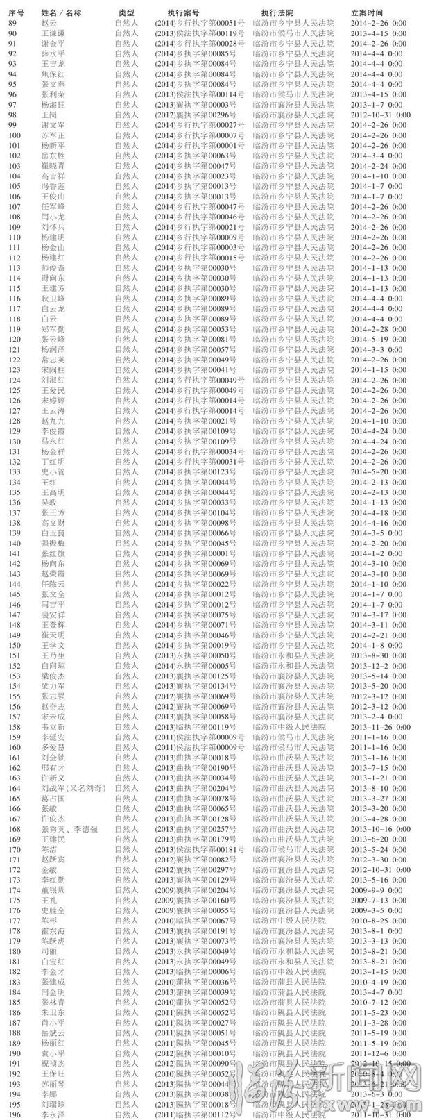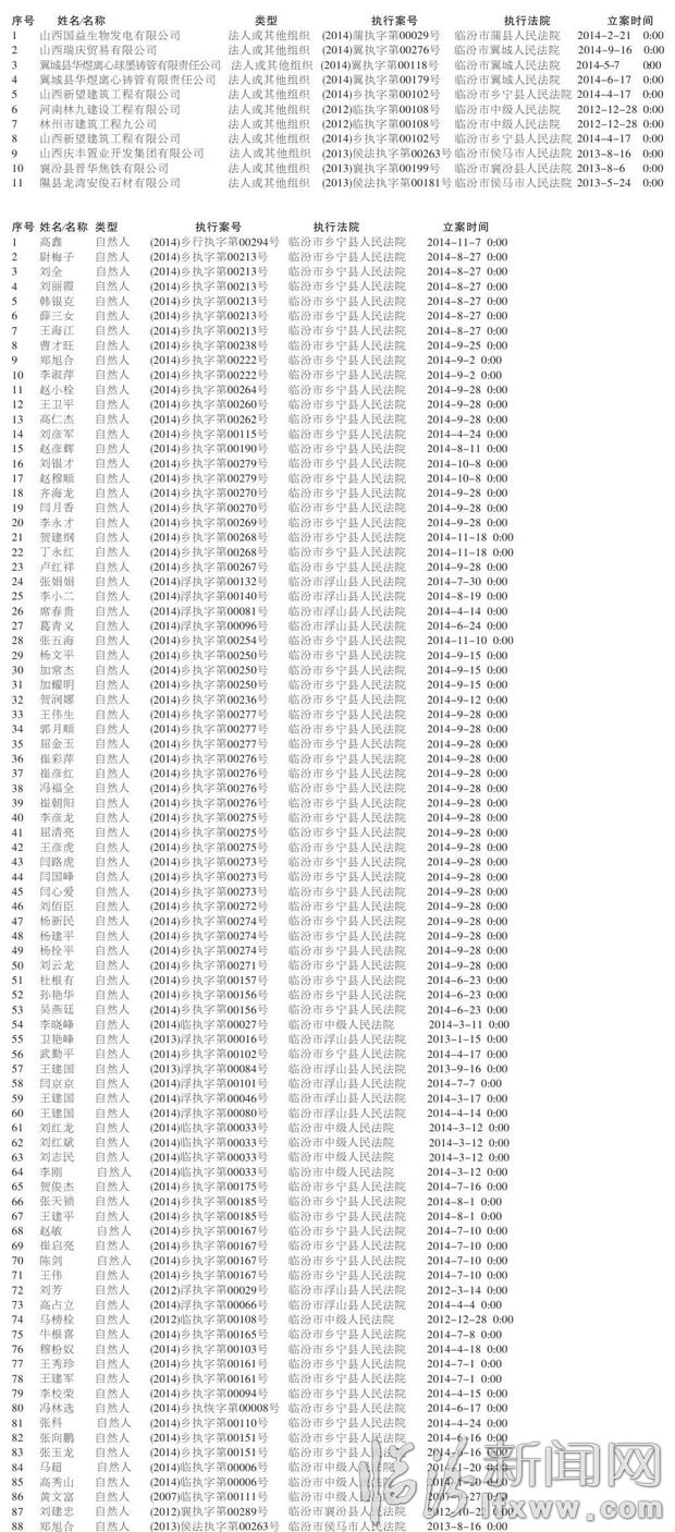 为了切实解决执行难,保障人民群众的合法权益,维护法律尊严,根据最高人民法院部署,临汾市中级人民法院将开展集中打击拒不执行判决、裁定等犯罪行为专项活动。为了深化此项活动,依法对有履行能力而拒不履行人民法院生效法律文书确定义务的人进行信用惩戒,现对临汾市法院系统失信被执行人名单予以公布。