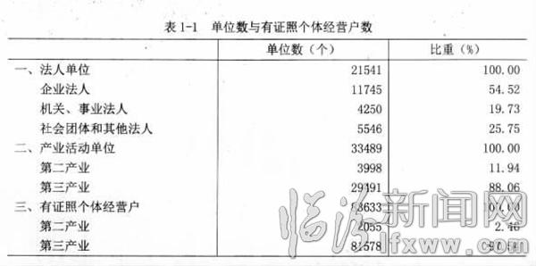 2013年末,全市共有从事第二产业和第三产业活动的法人单位21541个,比2008年末(2008年是第二次经济普查年份,下同)增加2568个,增长13.54%;产业活动单位33489个,增加4099个,增长13.95%;有证照个体经营户83633个,减少2090个,下降2.44%(详见表1-1)。