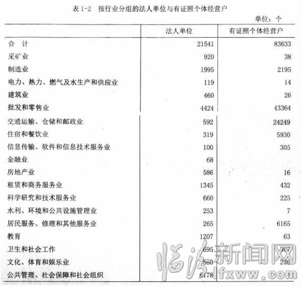 2013年末,在第二产业和第三产业法人单位中,位居前三位的行业是:公共管理、社会保障和社会组织6178个,占28.68%;批发和零售业4424个,占20.54%;制造业1995个,占9.26%。在有证照个体经营户中,位居前三位的行业是:批发和零售业43364个,占51.85%;交通运输、仓储和邮政业24249个,占28.99%;居民服务、修理和其他服务业6165个,占7.37%(详见表1-2)。
