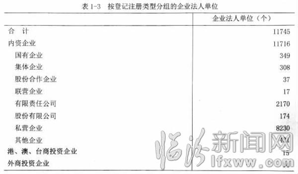 2013年末,全市共有第二产业和第三产业的企业法人单位11745个,比2008年末增加1762个,增长17.65%。其中,内资企业占99.75%,港、澳、台商投资企业占0.13%,外商投资企业占0.12%。内资企业中,国有企业占全部企业法人单位的2.97%,私营企业占70.07%(详见表1-3)。