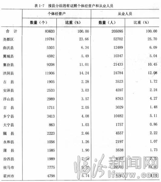 有证照的个体户数量排名前四位的是:尧都区占23.66%,比2008年下降了1.90个百分点;洪洞县占14.24%,下降了0.34个百分点;襄汾县占11.01%,提高了2.23个百分点;侯马市占9.30%,下降了1.05个百分点。有证照的个体户从业人员排名前四位的是:尧都区占25.70%,下降了7.53个百分点;侯马市占13.02%,提高了2.80个百分点;洪洞县占12.08%,下降了1.08个百分点;襄汾县占10.45%,提高了2.48个百分点(详见表1-7)。