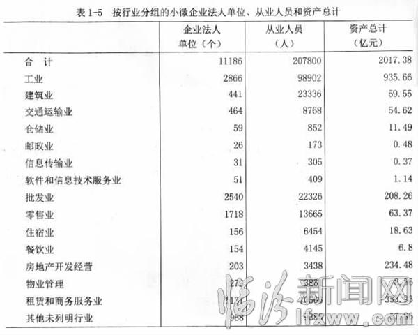 注:表中小微企业法人单位合计数含从事农、林、牧、渔服务业和兼营第二、三产业活动的农、林、牧、渔业小微企业法人单位99个,从业人员1215个,资产总计2.18亿元。
