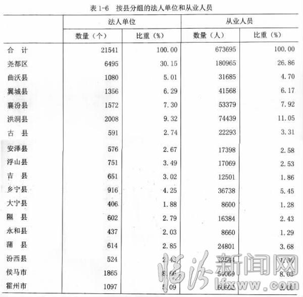 在法人单位中,位居全市前四位的县(市、区)是:尧都区占30.15%,比2008年末提高了0.07个百分点;洪洞县占9.32%,下降了1.29个百分点;侯马市占8.66%,提高了0.83个百分点;襄汾县占7.30%,提高了1.53个百分点。法人单位从业人员位居全市前四位的县(市、区)是:尧都区占26.86%,比2008年末下降了3.87个百分点;洪洞县占11.05%,提高了0.46个百分点;霍州市占9.00%,下降了0.04个百分点;侯马市占8.03%,下降了1.11个百分点(详见表1-6)。
