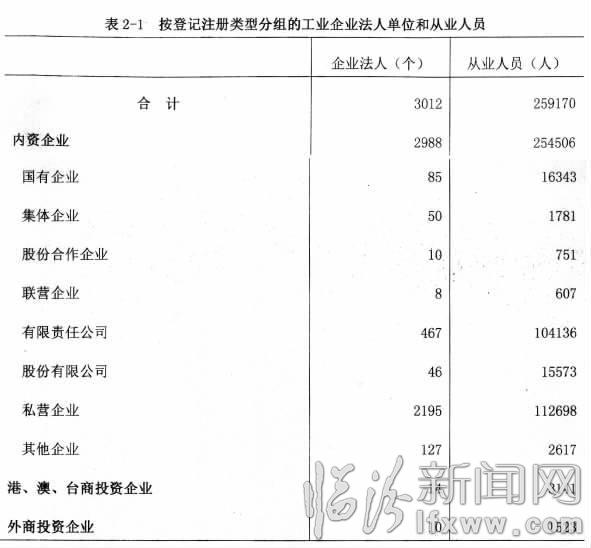 在工业企业法人单位中,内资企业2988个,占99.2%;港、澳、台商投资企业14个,占0.47%;外商投资企业10个,占0.33%。内资企业中,国有企业85个,占全部企业的2.82%;集体企业50个,占1.66%;私营企业2195个,占72.88%。